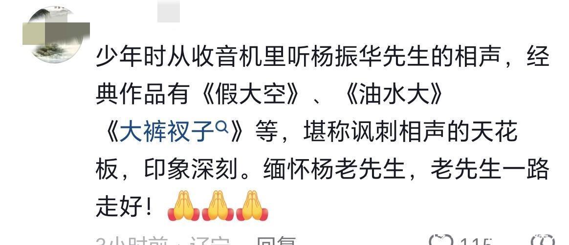 据京报网报说念,杨振华是辽宁省非物资文化遗产“沈阳相声”代表性传承东说念主,从1960年到2000年间,他创作的《合家欢》《北大仓》《新房》等作品屡次拿奖。